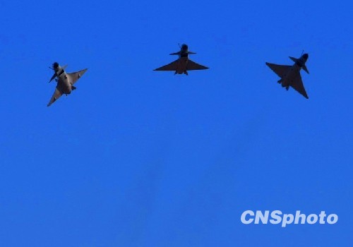 图为八一飞行队歼-10表演三机箭队水平向上开花。中新社发 宋吉河 摄