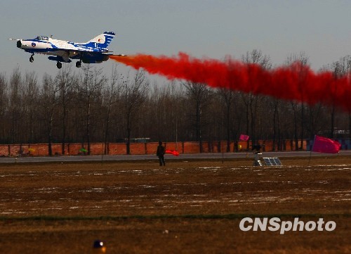 庆祝中国人民解放军空军成立60周年飞行表演,11月15日上午在北京沙河机场举行。表演按八一飞行表演队4架歼-10飞机表演12个动作和6架歼-7GB飞机表演15个动作,分四机对头交叉、四机菱形队大坡度盘旋、单机小速度平飞等27个动作,其中四机对头交叉动作是这次表演中技术难度较大的动作之一,这是国产三代飞机和国产二代飞机首次同场竞技表演。图为歼-7GB起飞。中新社发 宋吉河 摄