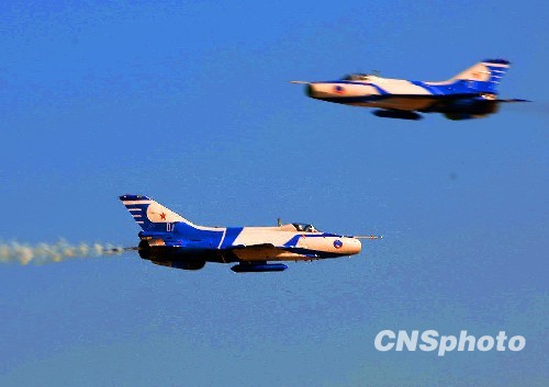 庆祝中国人民解放军空军成立60周年飞行表演,11月15日上午在北京沙河机场举行。表演按八一飞行表演队4架歼-10飞机表演12个动作和6架歼-7GB飞机表演15个动作,分四机对头交叉、四机菱形队大坡度盘旋、单机小速度平飞等27个动作,其中四机对头交叉动作是这次表演中技术难度较大的动作之一,这是国产三代飞机和国产二代飞机首次同场竞技表演。空军跳伞运动大队30名运动员表演了4个跳伞科目。中新社发 宋吉河 摄