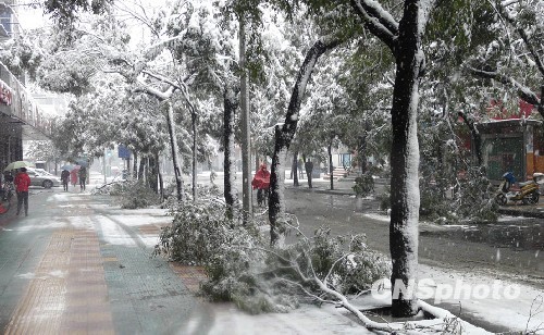 受冷空气影响,11月15日夜里起安徽省自北向南出现了大范围降雪。合肥市多处树木被大雪压断,导致部分路段受阻。中新社发 李君 摄