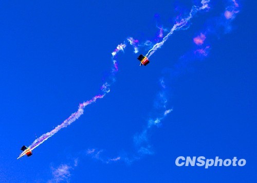 庆祝中国人民解放军空军成立60周年飞行表演,11月15日上午在北京沙河机场举行,空军跳伞运动大队30名运动员表演了4个跳伞科目,空中五彩缤纷的伞兵犹如仙女散花。