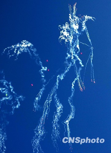 庆祝空军成立60周年跳伞表演犹如仙女散花。中新社发 宋吉河 摄