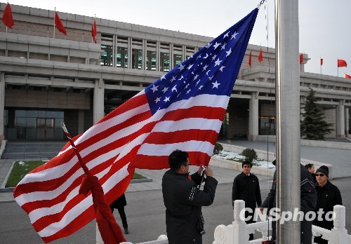 11月16日,北京首都机场新专机楼工作人员升起美国国旗迎接即将飞抵北京的美国总统奥巴马。中新社发 廖攀 摄