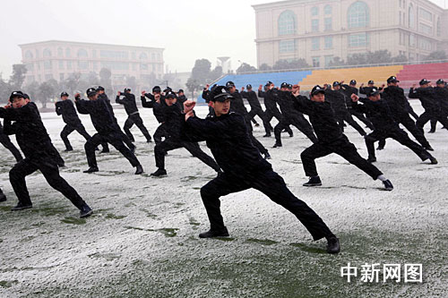 中新网武汉11月17日电 (肖新民)11月16日,湖北省武汉市迎来今冬第一场大雪,尽管天气十分寒冷,然而,全省首批公安特警培训班的学员们士气却十分高涨。操场上,北风飕飕,雪花飞舞,学员们却口号如雷。