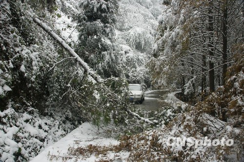 十堰山区公路上被暴雪压断的松树。中新社发 袁野 摄