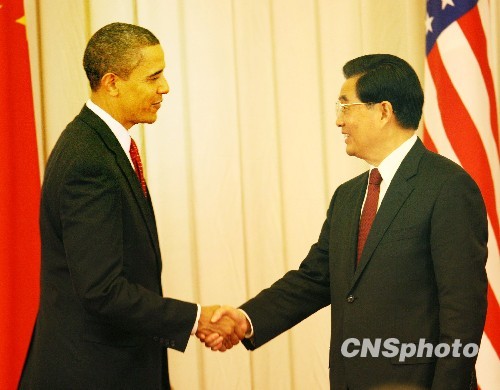 胡锦涛与奥巴马共同会见记者。中新社发 任晨鸣 摄