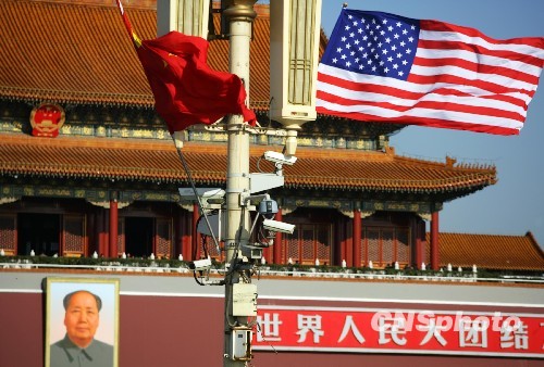 11月17日,北京天安门广场飘扬着中美国旗,以欢迎美国总统奥巴马访华。