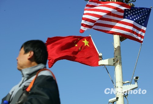 图:中美国旗飘扬欢迎奥巴马访华(2)