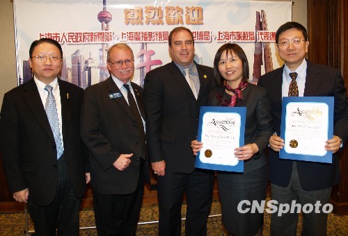 11月16日,上海市政府新闻办公室副主任王建军率“上海世博会宣导团”一行8人飞抵美国洛杉矶,受到加州众议员科特·海格曼、加州核桃市华裔女市长王秀兰、中美电影节主席苏彦韬等的热烈欢迎。加州众议员科特·海格曼向上海市政府新闻办公室副主任王建军、上海市文化广播影视管理局副局长刘文国颁发欢迎状。