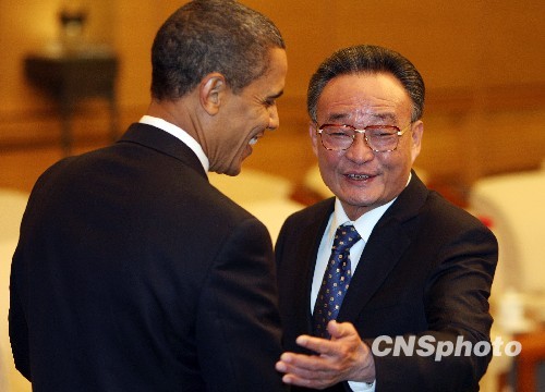 中国全国人大常委会委员长吴邦国在北京人民大会堂会见美国总统奥巴马。中新社发 任晨鸣 摄