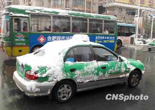 合肥出租车个个显得蓬头垢面,迎风开车时撒下一路雪花。中新社发 邱江波 摄
