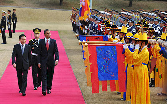 11月19日,在位于韩国首都首尔的总统府青瓦台,美国总统奥巴马与韩国总统李明博出席欢迎仪式。韩国总统李明博与奥巴马当日上午在总统府青瓦台举行首脑会谈。韩美两国政府一致表示,此次韩美首脑会谈的议题将集中在朝核问题解决方案和对朝鲜政策以及韩美自由贸易协定上。