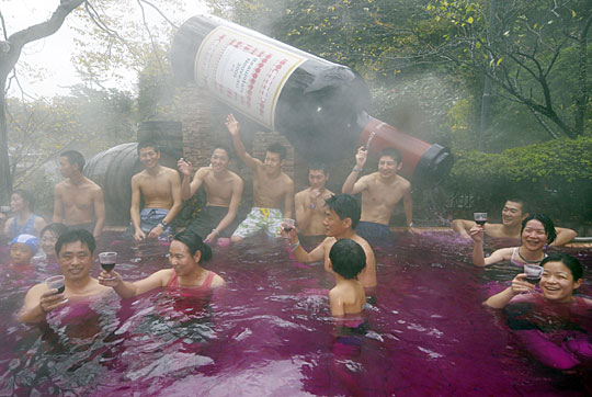 图为人们享受美酒的同时,还在享受美酒SPA带来的舒适。