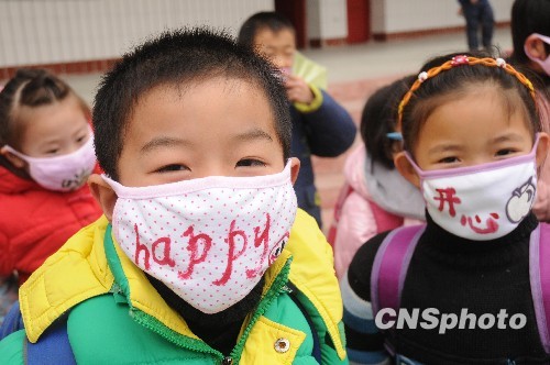 图为11月19日,几名戴着“问候口罩”的小学生在校园玩耍。中新社发 付海厚 摄