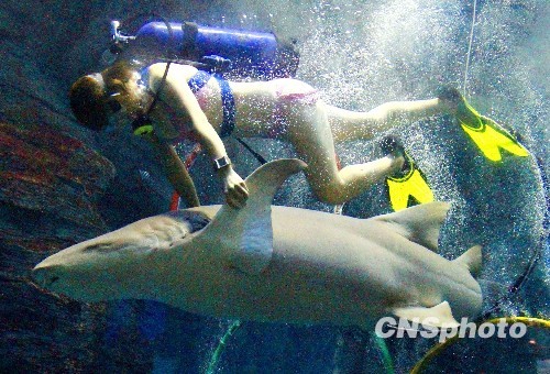 11月21日,在广西北海旅游景点“海洋之窗”海底世界展厅的亚克力玻璃巨型圆缸内,上演惊险刺激的人鲨共舞表演,吸引众多游客纷纷驻足观赏。