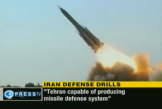 图为伊朗一家电视台播出的防空演习的电视截图。