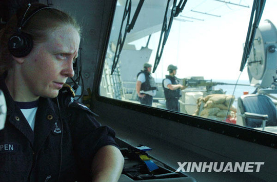 11月22日,在亚丁湾海域,一名荷兰“埃沃特森”舰女军官指挥反海盗轻重武器射击演练。当天,中国海军第三批护航编队指挥员王志国少将一行7人应邀登临欧盟465编队旗舰、荷兰“埃沃特森”号导弹护卫舰进行访问。欧盟465编队指挥官、荷兰海军彼得·宾特准将热情接待了中国客人,双方就各自近期掌握的索马里海盗活动特点、护航组织方式等事项进行了会谈交流。