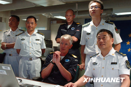 11月22日,正在亚丁湾执行护航任务的中国海军第三批护航编队指挥员王志国少将(前排右一)在欧盟465编队指挥官、荷兰海军彼得·宾特准将(前排右二)的陪同下观看欧盟465编队反海盗情况多媒体演示。