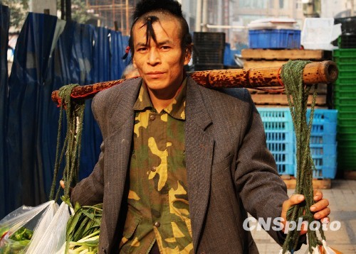 11月23日,留着山寨版莫西干头、被网友戏称为重庆“最潮力哥”的程普春生意一如往常好,在重庆闹市较场口的农贸市场帮往来买菜的老太太们担菜赚钱。