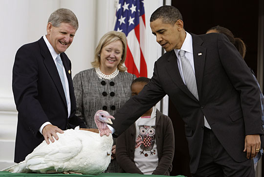 11月25日,美国总统奥巴以感恩节前夕大秀亲民形象,不但在白宫门前赦免了火鸡,还在慈善机构“马大的餐桌”前帮助分发食品。