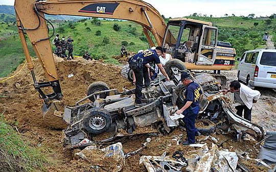 在菲律宾马京达瑙省安帕图安镇,警方调查人员在一处犯罪现场搜寻证据、寻找遇害者遗体。