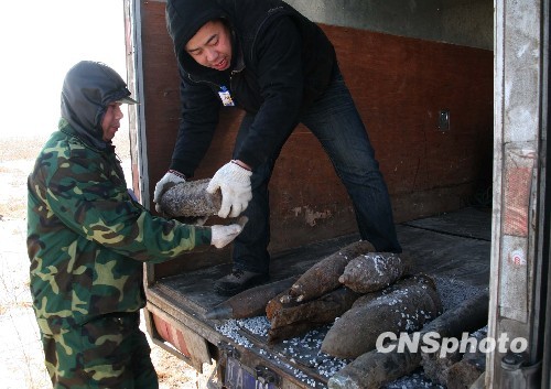 图为工作人员在搬运废旧炮弹。中新社发 黄金昆 摄