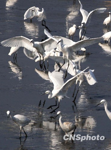 11月27日上午,在福州大学新校区附近的鱼塘里,千余只白鹭低旋觅食,嬉戏飞舞,场面蔚为壮观。白鹭是福建省级保护动物,随着福州市生态环境明显改善,多种珍稀鸟类的选择在此迁徙停歇、繁殖生存。中新社发 杨婀娜 摄