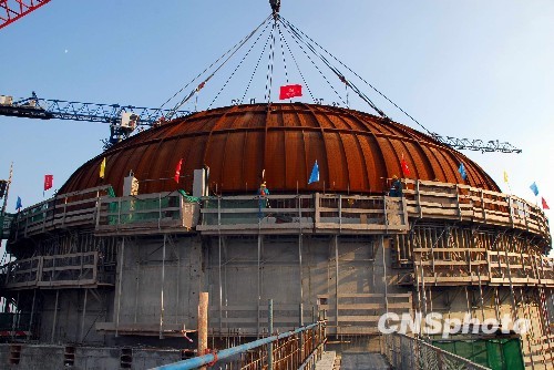 11月27日下午,福建宁德核电一号机组提前65天实现穹顶吊装,标志着宁德核电项目一号机组已由土建高峰提前转入设备安装高峰。福建宁德核电站是国家核电中长期发展规划颁布后开工的第一个核电项目,项目总投资约500亿元人民币,全部运行后年发电量可达300亿千瓦时。中新社发 王东明 摄