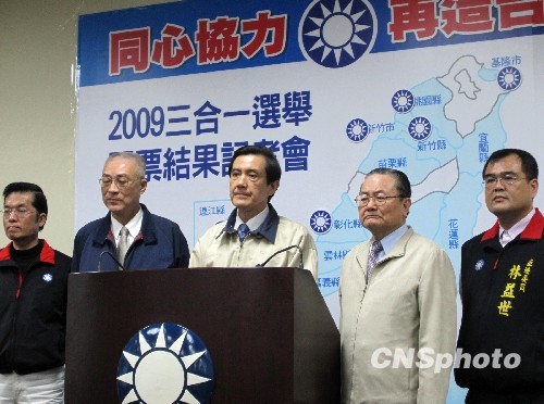 中国国民党主席马英九抵达国民党总部谈选举结果。中新社发 黄少华 摄