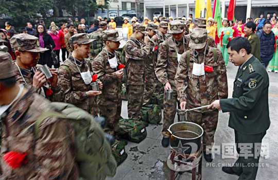 图为12月5日,第二批进藏新兵起运前,武装部后勤科科长代寿勇在给新兵分发药汤时的场面。朱志斌 摄