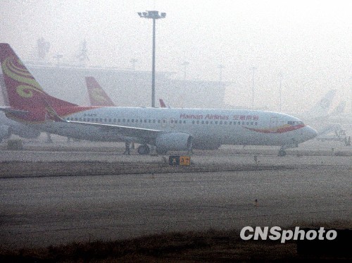 12月8日,罕见的浓雾从凌晨开始笼罩西安市以及周边地区,机场与高速公路全部封闭,直至下午14时后机场才部分开放,等候起飞的飞机排起长队。中新社发 任晨鸣 摄