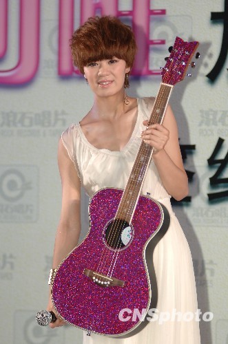 12月8日下午,郁可唯在北京正式签约加盟滚石唱片,成为09“快乐女生”中成功签约唱片公司并举办签约记者会的第一人。滚石宣布了打造郁可唯签约后首张专辑的“Y计划”,将力邀华语乐坛10位顶尖音乐制作人担当专辑制作,并在签约100天后即2010年3月18日发行郁可唯签约滚石后的第一张专辑。图为郁可唯一袭雪纺白纱长裙尽显典雅与时尚的气质,手中怀抱歌迷送上的炫亮吉他。中新社发 李学仕 摄