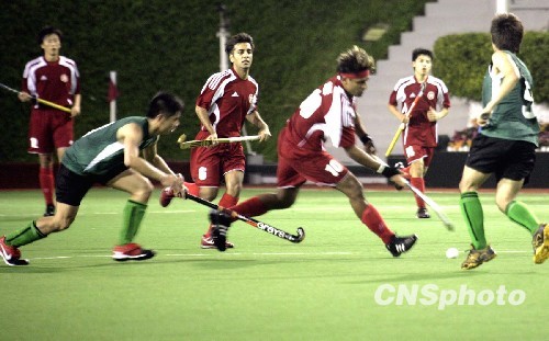 十二月九日晚,香港2009东亚运动会曲棍球男子循环赛在香港京士柏曲棍球场举行,中国香港队(红衣)以5:0的成绩胜中国澳门队。中新社发 张勤 摄