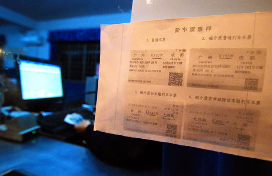 图为九江站售票处张贴的新、老版火车票票样。胡国林 摄