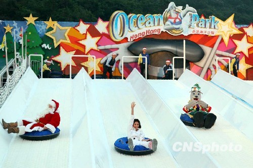 香港海洋公园“魔幻圣诞2009”将于12月12日起正式开幕。十日晚,海洋公园主席盛智文与一众嘉宾来到闪亮亮圣诞花园,在沪江小学合唱团的美妙歌声衬托下,在高达12米的巨型圣诞树前启动亮灯仪式。中新社发 洪少葵 摄