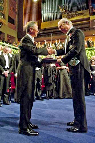 12月11日,2009年诺贝尔奖颁奖礼昨在瑞典斯德哥尔摩演奏厅举行,一生获奖无数的光纤之父、前香港中文大学校长高锟,正式从瑞典国王古斯塔夫.卡尔16世(Carl XVI Gustaf)手中接过诺贝尔物理学奖。期间大会更为他作出特别安排,由国王走到其座位旁边颁奖,盛装出席的他,以灿烂的笑容迎接气氛庄严但欢乐的历史性一刻。