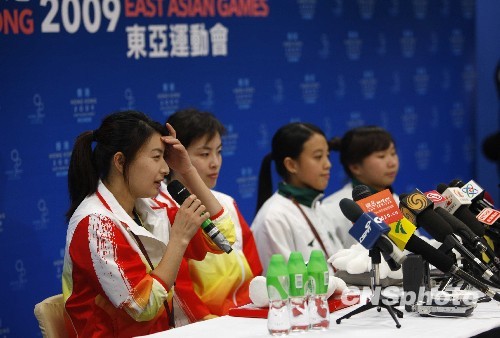 图:郭晶晶东亚运摘金 赛后笑对记者提问(3)
