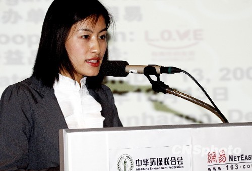 图为中华环保联合会环境公益与项目部长王雨竹在会议上致辞。中新社发 钱兴强 摄
