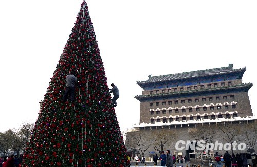 2009年12月13日,北京前门大街,几名工人正在一棵十余米高的“圣诞树”上加紧布置彩灯。据悉,这是前门大街首次搭建“圣诞树”,为充满明清古韵的街道增添了一道独特的风景。