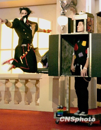 图为首次来港献技的澳洲魔术师正在表演柔和媲美的“米高积逊”舞艺的魔术。中新社发 张勤 摄