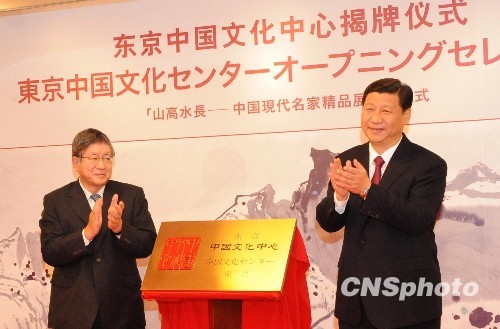 图:习近平与横路孝弘为东京中国文化中心揭牌