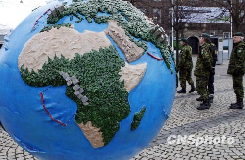各种反映社会环保问题的雕塑作品、图片及标语吸引众多市民和各国人士驻足观看。中新社发 钱兴强 摄