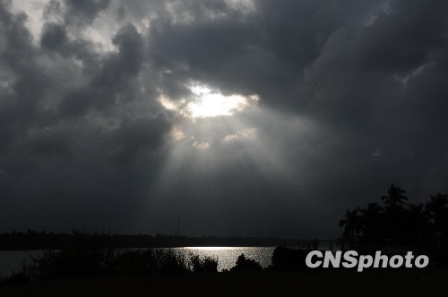 12月14日,海南琼海,落日穿透乌云放射出耀眼的光芒,像一盏天灯映射在万泉河上,分外美丽壮观。中新社发 蒙钟德 摄