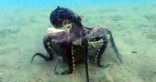 图为一只章鱼用触腕缠绕着一个椰子壳。