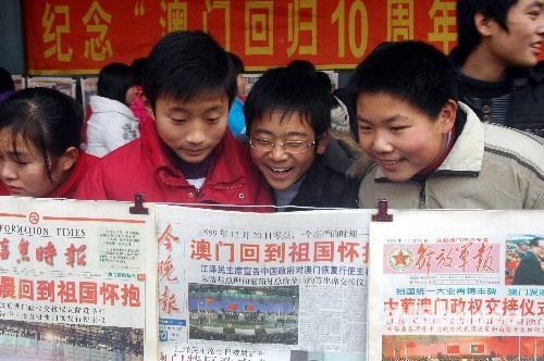 中学生们被丁思德老人举办的“澳门回归十周年藏报展”所吸引。中新社发 房德华 摄
