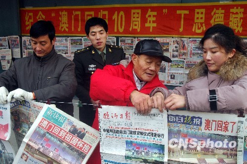 丁思德(右二)老人在郯城县未来中学布置“澳门回归十周年藏报展”。中新社发 房德华 摄