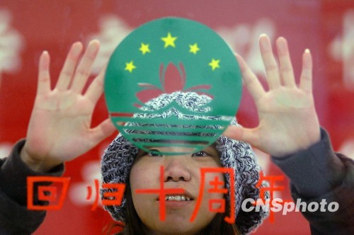 12月18日,扬州大学文学院对外汉语专业的澳门籍大学生黄珊和同学们一起动手制作剪纸作品——澳门特别行政区区徽“五星莲花”图案,迎澳门回归祖国10周年。