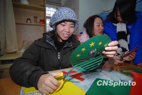澳门籍大学生黄珊(左)和同学一起制作剪纸区徽,庆祝澳门回归十周年。中新社发 陈中秋 摄