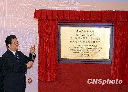 12月19日下午,国家主席胡锦涛在澳门出席澳门科学馆开幕典礼并亲手为之揭幕。