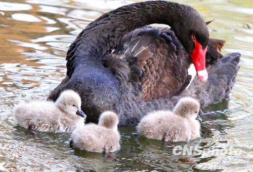 12月19日,苏州动物园里破壳而出才两天的3只黑天鹅宝宝在其“父母”的陪护下,首次被带进池塘戏水,为游客增添了不少冬日情趣。